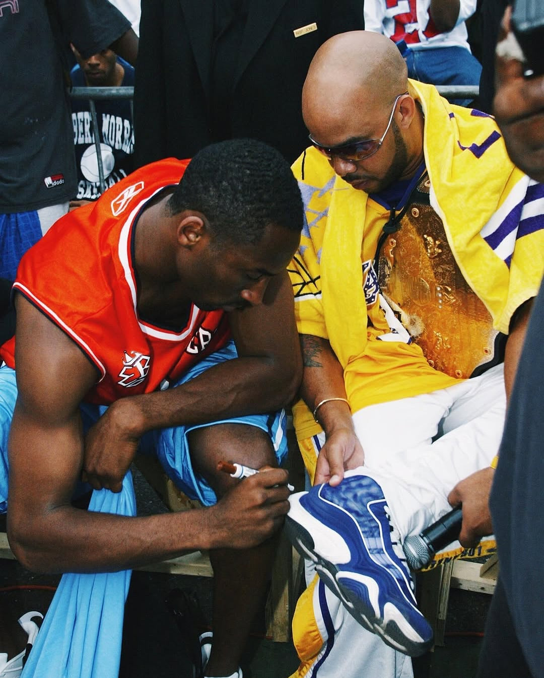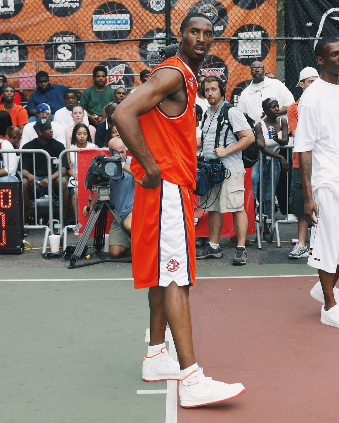 July 18, 2002 - Straight from parading South Figueroa Street in DTLA to Harlem's Rucker Park, the Mecca of Streetball. Kobe Bryant, coming fresh off the Lakers' 3peat Championship, made his way Uptown to play in the Rucker's summer games, the Entertainer's Basketball Classic. Pandemonium met him at the cages, and of course he gave the neighborhood what they came to see. With announcer Hannibal on the mic calling the game, Lord of the Rings was given his name. Always with a way of paying homage in his own particular fashion on and off the court, there was nothing else Kobe was going to lace up on 155th street's legendary green-top besides a pair of all-white-orange-bottom UP's.
